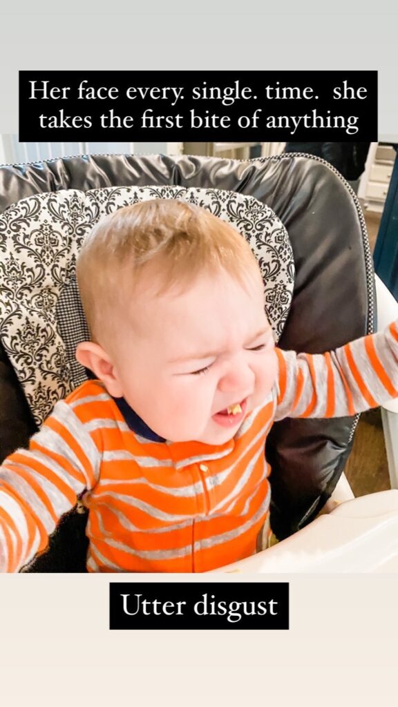 Now, if you remember from last month, Claire’s “first solid” was black chalk… This month, we introduced her to more traditional foods. Her favorites are sweet potatoes and peanut butter oatmeal. However, she’s not a big fan of any foods, especially the first bite. Doesn’t matter how many times she’s eaten something, she has a look of utter disgust every single time you feed her something. Also, she cannot figure out how to eat from a spoon and not drink it. I have a feeling we’ll be working on this for a while.